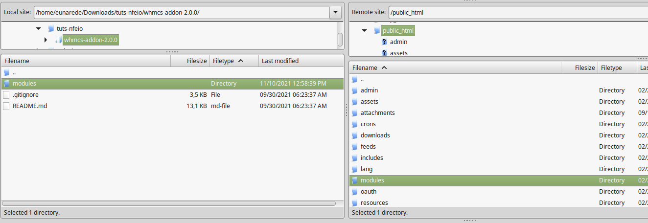 Por exemplo, tendo o WHMCS instalado em public_html, carregue o diretório modules em public_html.