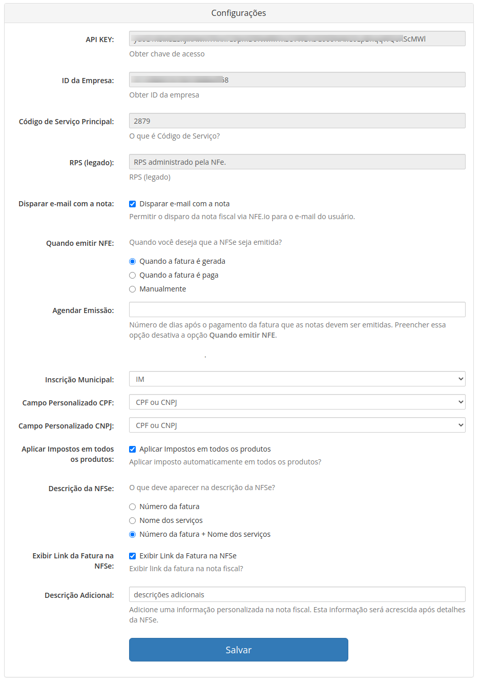 Ao ativar a nova versão, todas as configurações globais do módulo serão automaticamente migradas. Configurações como API Key e ID da empresa já poderão ser visíveis como exemplificado na imagem a seguir.