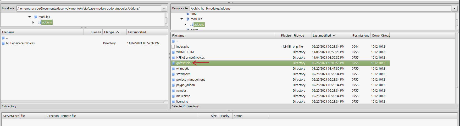Para isso, utilize seu cliente FTP preferido para acessar o WHMCS, navegue até o diretório seu_whmcs/modules/addons para visualizar os módulos adicionais existentes em seu WHMCS e localize o diretório nomeado gofasnfeio como demonstrado na imagem a seguir.